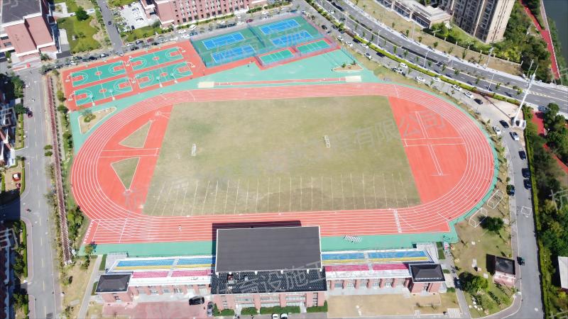 2024年由杭州宝力体育设施工程有限公司承建的温州医科大学洞头校区项目,含标准塑胶跑道、多彩看台及篮球场等,周边红砖建筑与绿化带相映,营造活力健康的校园氛围,满足多样化体育需求。
